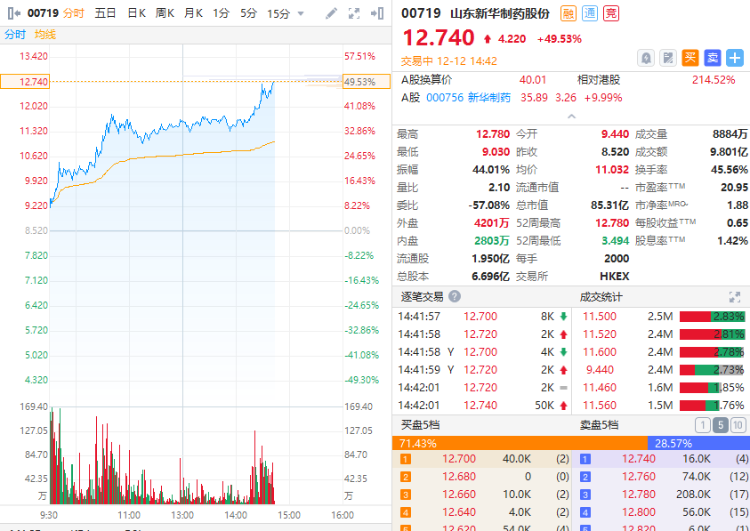山东新华制药(00719)午后涨49.53%,月内累涨超138%。截至发稿,12.74报12.06港元,成交额9.8亿港元。