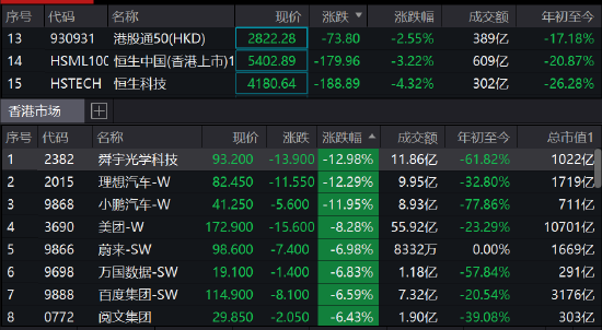 恒生科技指数午后跌幅扩大至4.32%,舜宇光学、理想汽车跌超12%