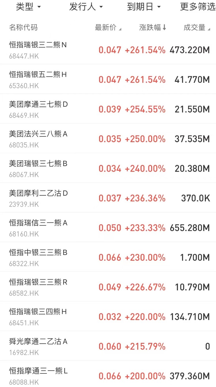 在今日涨幅榜中,恒指瑞银三二熊N $68447.HK 涨261.54%,美团摩通三七熊D $68469.HK 涨254.55%,美团法兴三八熊A $68035.HK 涨250%。