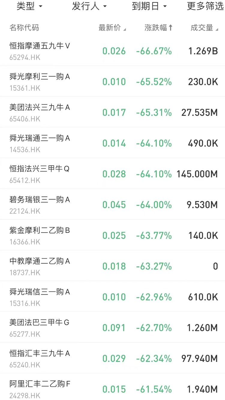在今日跌幅榜中,恒指摩通五九牛V $65294.HK 跌66.67%,舜光摩利三一购A $15361.HK 跌65.52%。