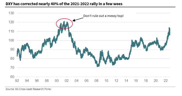 随着美联储的加息周期接近尾声,同时各国面临货币贬值的负面影响开始显现,个人认为美元将会在2023年见顶下跌。欧洲中央银行在赶上美联储的加息步骤后,欧元对美元的利差会有所缩减,减少欧元的贬值压力。同时G20国家也有合作干预外汇市场,避免美元继续升值的需求。就像2000-2002年的历史先例,美元指数会在高位震荡,但是开始下行周期。