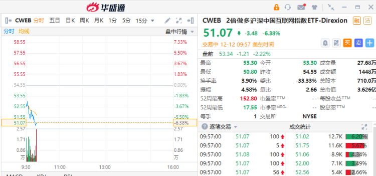 ETF方面,2倍做多沪深中国互联网指数ETF-Direxion跌6.38%,3倍做多富时中国50指数-Direxion跌5.65%。