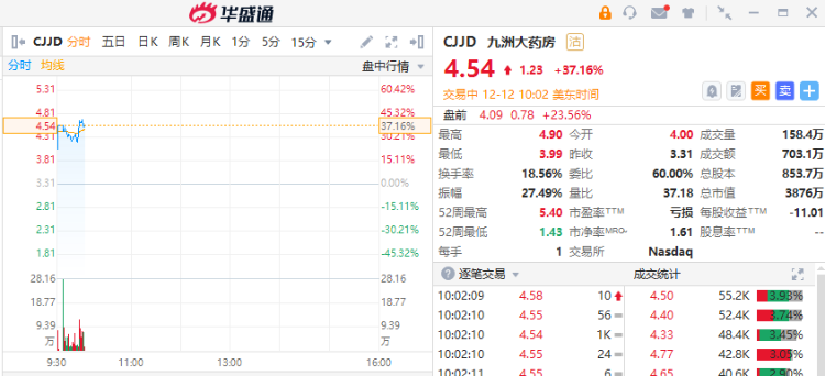 九洲大药房逆势大涨37.16%,报4.54美元,东方文化涨19.65%,理想汽车涨1.04%。
