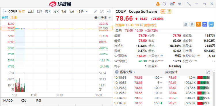 Coupa Software $COUP 涨超26.69%,该公司已与私募股权公司Thoma Bravo达成了一项协议,将被后者以每股81美元的现金收购,较周五收盘价溢价30.4%。
