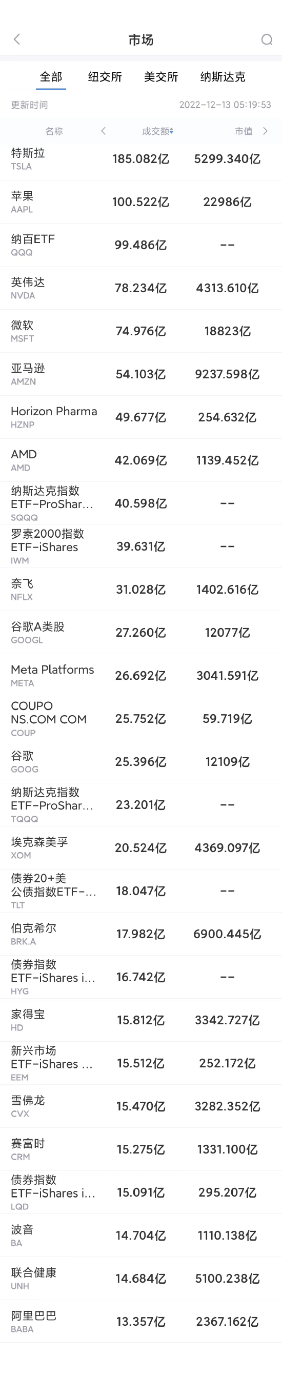第20名阿里收跌2.11%,成交13.4亿美元。