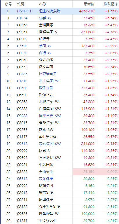 科网股方面,美团-W涨3.99%,小米集团-W涨1.97%,腾讯控股涨1.83%,阿里巴巴-SW涨1.19%,京东集团-SW涨0.43%,哔哩哔哩-SW跌超3%;