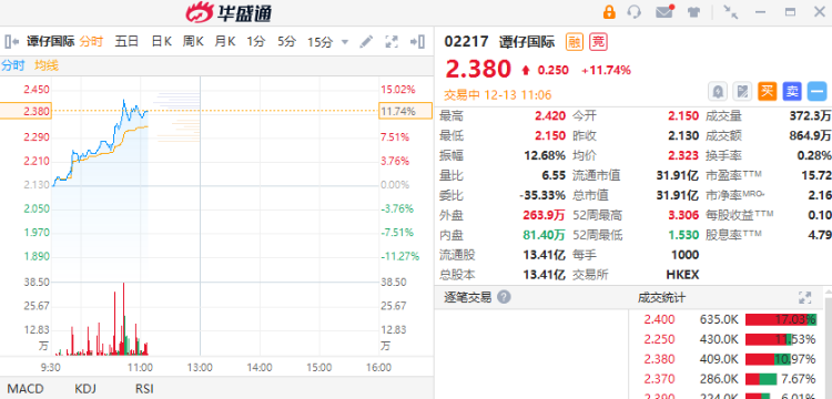 华盛资讯12月13日消息,港股香港本地股拉升,截至发稿,谭仔国际涨近12%,报2.38港元。莎莎国际涨超8%,太兴集团涨超7%,九龙仓置业涨超6%,大家乐集团涨超5%,港铁公司涨超2%。