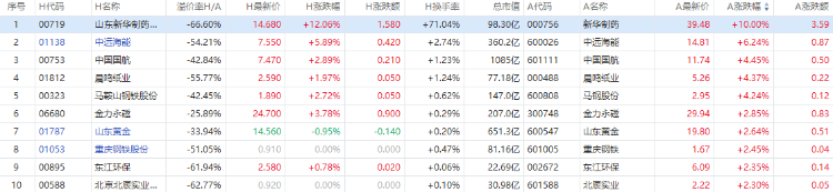 截至A股收盘,AH股涨幅前10如下: