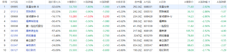 荣昌生物A股跌近3%,H股跌超1%;丽珠医药A股跌超2%,H股跌近4%;福莱特玻璃A股跌超2%,H股跌超5%。