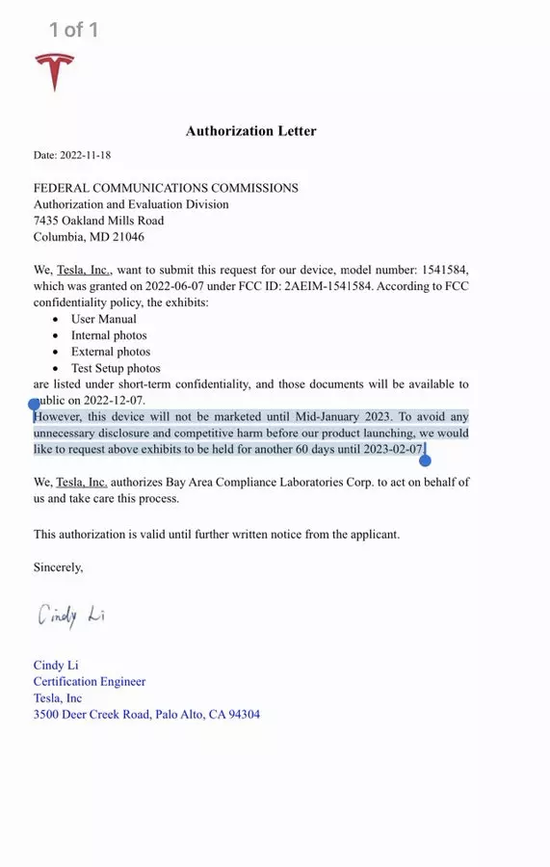 给 FCC 的授权信上写着:“...... 该设备要到 2023 年 1 月中旬才会上市。为避免在我们的产品发布前发生任何不必要的披露和竞争损害,我们要求将上述展品再保留 60 天,直到 2023-02-07。”FCC 文件显示,监管机构已批准特斯拉的延长保密请求。