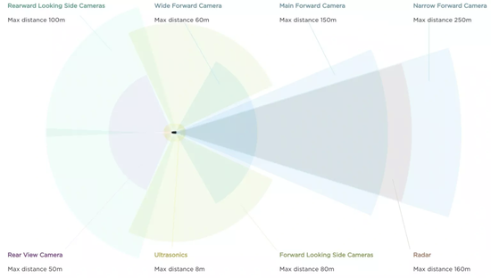 此前特斯拉的传感器方案为 8 摄像头,辅以 1 个前置毫米波雷达,12 超声波雷达。