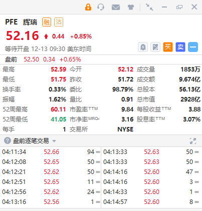 辉瑞盘前涨0.65%,辉瑞新冠特效药Paxlovid国内网售放开,可凭核酸或抗原结果购买。