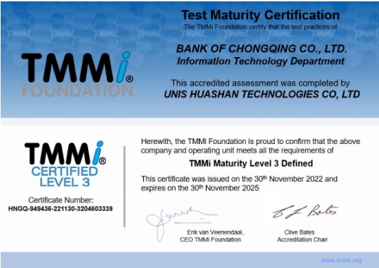 资料显示,TMMi(Test Maturity Model integration即“测试成熟度模型集成”)是当前国际最权威的测试组织成熟度评估模型之一,是软件产品质量管理水平最有力的资质证明。本次重庆银行通过该认证,标志着重庆银行软件测试能力整体成熟度已达到国内先进水平。