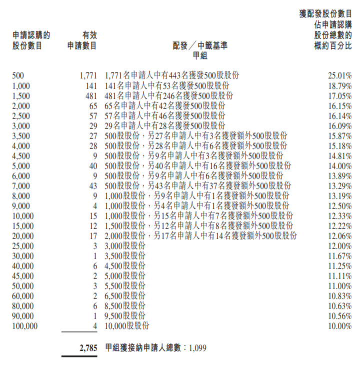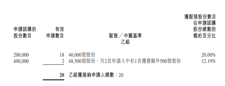 香港公开发售项下的发售股份最终数目为163.5万股发售股份,相当于全球发售项下初步可供认购发售股份总数10%(于任何超额配股权获行使前)。合共1119名股东获分配香港公开发售项下的发售股份,其中943名股东(相当于获分配香港公开发售项下发售股份的股东约84.27%)获分配一手发售股份,合共47.15万股股份,相当于香港公开发售项下发售股份总数约28.84%。