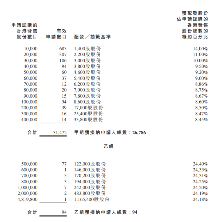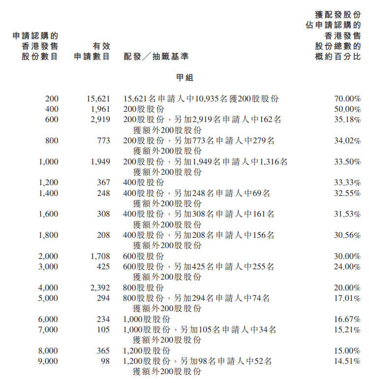 香港公开发售项下初步提呈发售的香港发售股份已获超额认购,公司合共接获31566份有效申请,认购合共1.47亿股香港发售股份,相当于香港公开发售项下初步可供认购香港发售股份总数963.98万股的约15.3倍。香港公开发售的发售股份最终数目为2891.92万股发售股份,占全球发售项下初步可供认购发售股份总数的约30%(在行使超额配售权之前),并已分配予香港公开发售的26880名获接纳申请人。