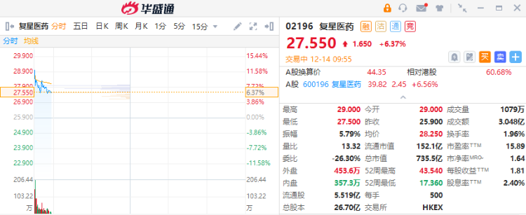 12月14日讯,复星医药早盘高开近12%,截至发稿,现涨超6%,成交额超3亿港元。