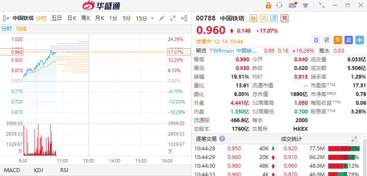 华盛资讯12月14日消息,中国铁塔早盘拉升走强,截至发稿,现涨超17%,报0.96港元。