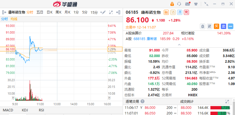 受此消息影响,康希诺A股一度拉升涨超3%,H股一度涨近6%,随后纷纷回落。