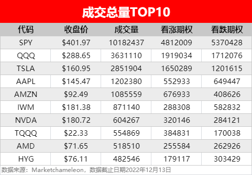 - 美国11月CPI创下年内最小涨幅,通胀超预期降温巩固了市场对美联储放缓加息的预期,期权成交量Top 10榜单环比均有增长。特斯拉 $TSLA 、苹果 $AAPL 、亚马逊 $AMZN 期权成交总量均超百万张。