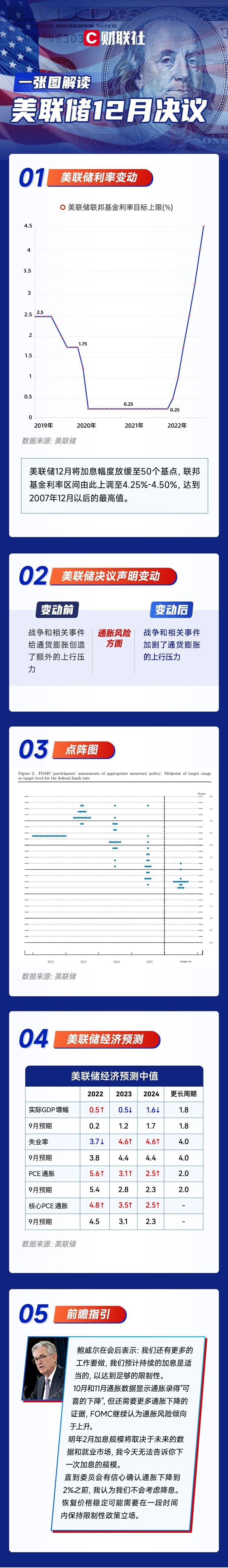 与预期一致,负责制定利率的联邦公开市场委员会(Federal Open Market Committee)投票决定将隔夜拆借利率上调0.5个百分点,使其达到4.25%至4.5%的目标区间。此次加息打破了此前连续四次加息0.75个基点的局面,这是自上世纪80年代初以来最激进的政策举措。
