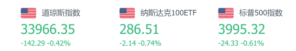 周四,道指收跌142.29点,跌幅为0.42%,报33966.35点;纳指跌85.93点,跌幅为0.76%,报11170.89点;标普500指数跌24.33点,跌幅为0.61%,报3995.32点。