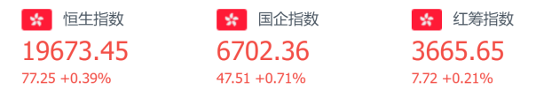 周三,恒生指数涨0.39%或77.25点,报19673.45点,全日成交额1363.64亿港元;恒生国企指数涨0.71%,报6702.36点;恒生科技指数涨0.34%,报4237.66点。