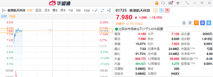 12月15日讯,香港航天科技(01725)逆市涨超15%,成交额1.61亿港元,旗下附属Aspace将发展卫星互联网通讯服务板块。