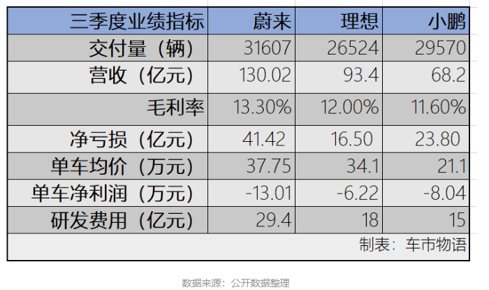 虽然三家企业在三季度的交付量都实现了不同程度的上涨,亏损面却在不断扩大。就连一向以“会赚钱”见长的理想:上一季度的亏损额仅为蔚来、小鹏的零头,也跌入了近几年来三季度的“至暗时刻”。