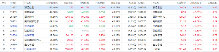 截至发稿,浙江世宝A股涨4.35%,H股现涨4.17%;中集车辆A股涨3.25%,H股跌近5%;百济神州A股涨2.72%,H股微涨。