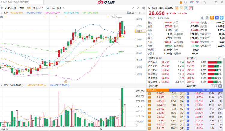 - 华虹半导体是一家半导体晶片的生产和销售的公司,主要生产200毫米和300毫米晶圆,可用于手机、物联网(IoT)、新能源汽车等芯片市场。公司三季度归母净利升104.5%,毛利率上升至37.2%创新高。