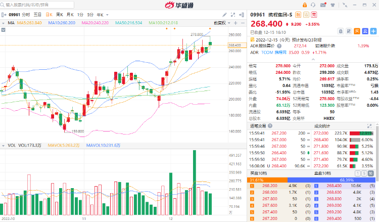 - 携程集团-S是一家主要从事一站式旅游平台运营的公司。12月15日,携程公布Q3财报,该季度净营业收入为69亿元,净利润为2.45亿元,实现同比扭亏为盈;经调整EBITDA为14亿元,同比增长164%。