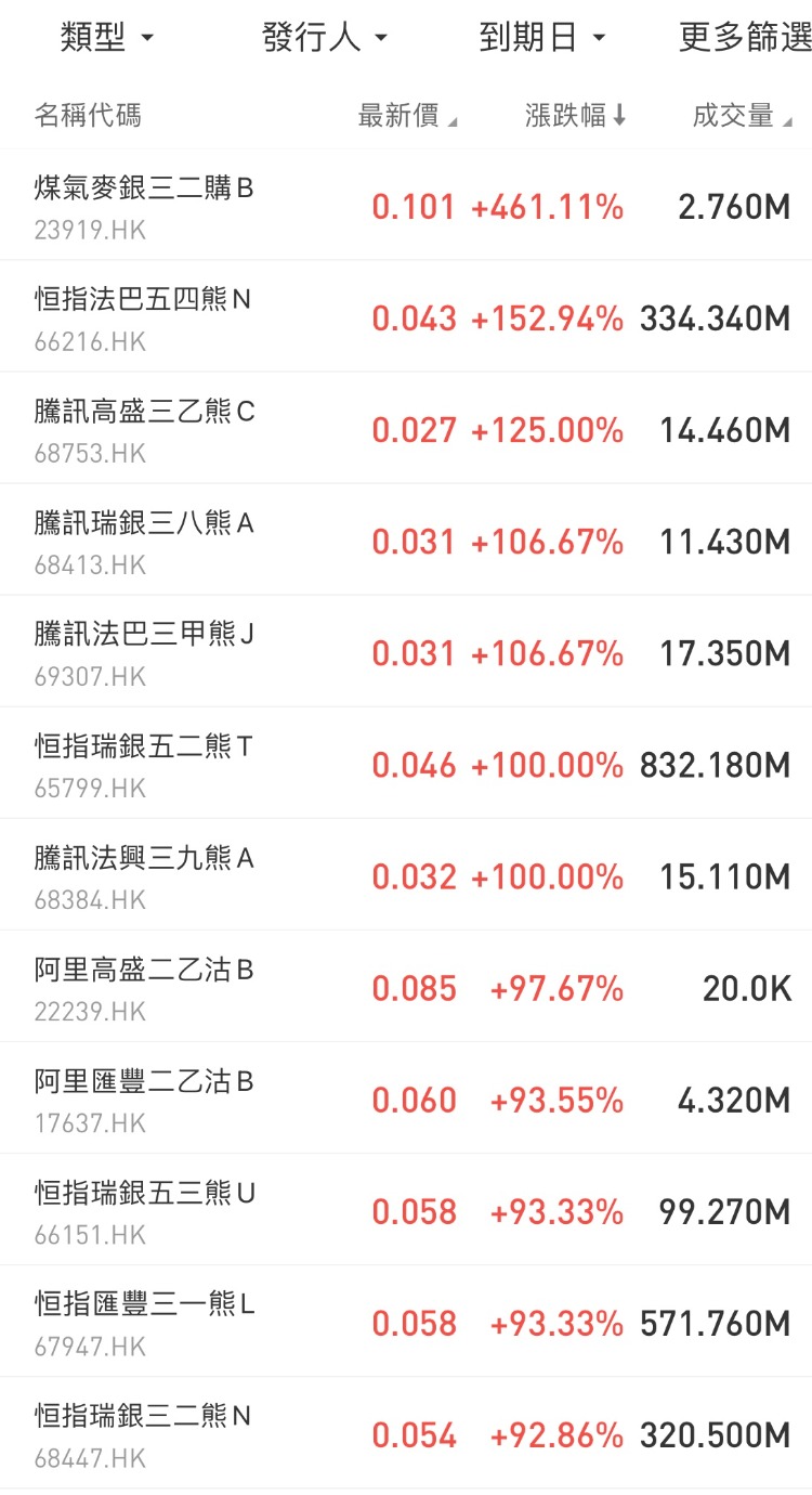 编者按:今日所有窝轮牛熊证合计成交119.15亿港元,占大市成交11.28%;煤气麦银三二购B $23919.HK 涨461.11%占据涨幅榜第一。