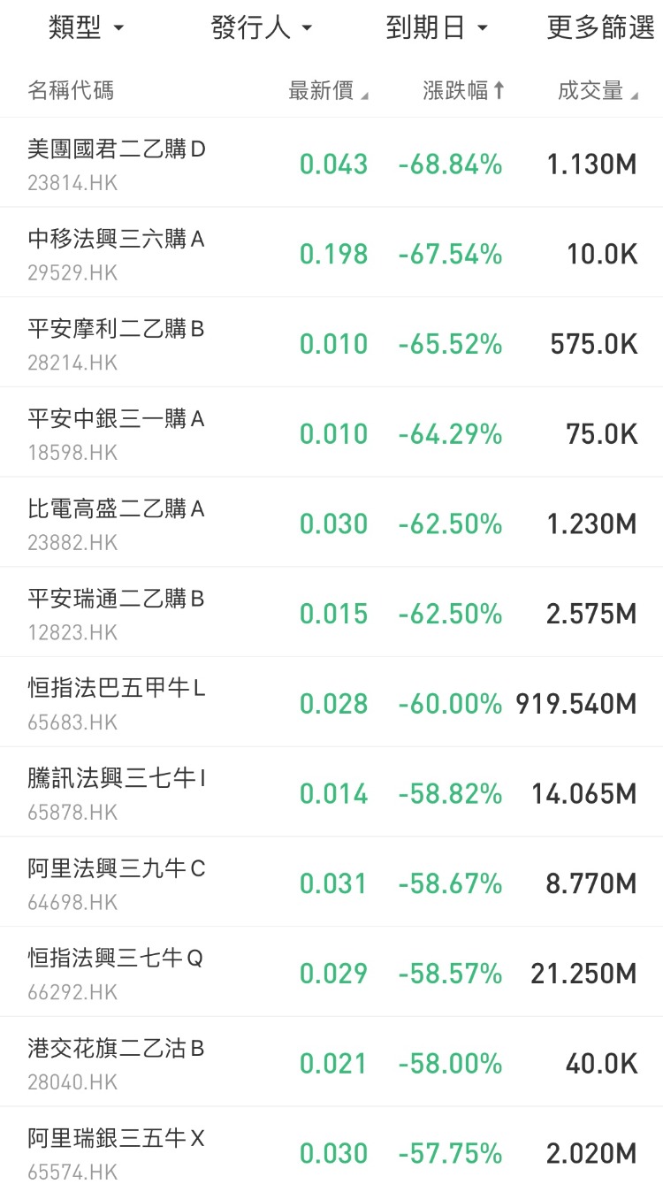 在今日跌幅榜中,美团国君二乙购D $23814.HK 跌68.84%,平安摩利二乙购B $28214.HK 跌65.52%。