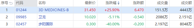 休闲食品企业卫龙收跌5.11%,全日成交额2.151亿港元,最新总市值超235亿港元;汽轮生产商步阳国际首日大跌40%,全日成交额8048万港元。