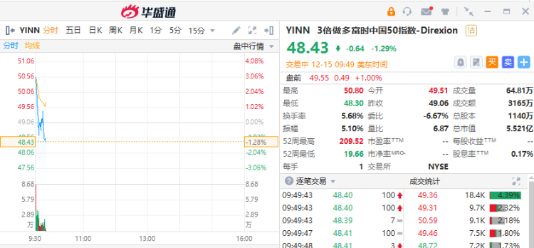 3倍做多富时中国50指数-Direxion跌1.29,2倍做多沪深中国互联网指数ETF-Direxion跌0.89%。
