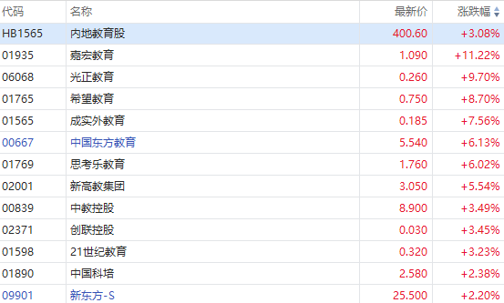 华盛资讯12月16日消息,教育股逆市上扬,截至发稿,嘉宏教育涨超11%,光正教育涨超9%,希望教育涨超8%,思考乐教育、中国东方教育涨超6%,中教控股涨超3%,新东方-S涨超2%。