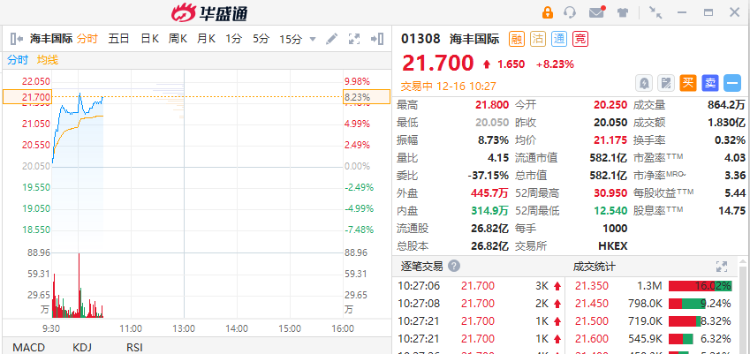 华盛资讯12月16日消息,海丰国际(01308)早盘再度走强,截至发稿,涨8.23%,报21.7港元,成交额1.83亿港元。该股近七个交易日累涨逾40%。