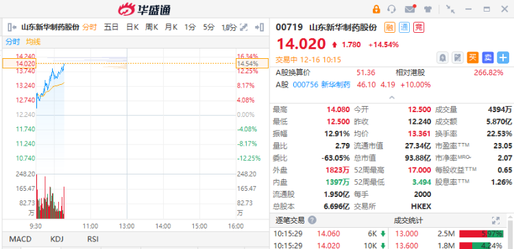 华盛资讯12月16日消息,山东新华制药股份(00719)早盘急升,截至发稿,涨14.54%,报14.02港元,成交额5.87亿港元。值得关注的是,该股十个交易日累计涨幅近170%。