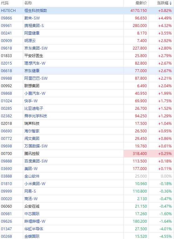 科网股方面,京东集团、阿里巴巴涨超2%,快手涨超1%;