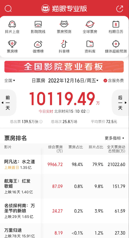 猫眼专业版数据显示,截至12月16日15时10分,今日电影票房破1亿元,为10月7日以来首次。电影《阿凡达:水之道》首日票房超9523.2万元,超《侏罗纪世界3》首日票房成绩,成2022年进口片首日票房冠军。