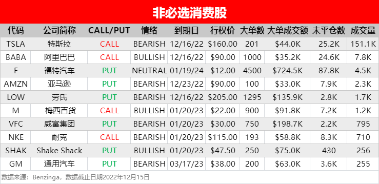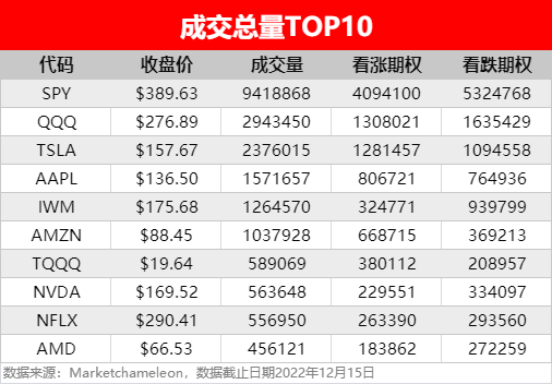 特斯拉 $TSLA 、亚马逊 $AMZN 、苹果 $AAPL 、英伟达 $NVDA 及AMD $AMD 等科技股期权交易持续活跃,连续霸榜前十。特斯拉在连续下跌后,周四出现小幅反弹。据悉12月15日,特斯拉在推特上分享了新的产量数据,特斯拉美国得克萨斯州奥斯汀新工厂的Model Y周产量已达到3000辆。