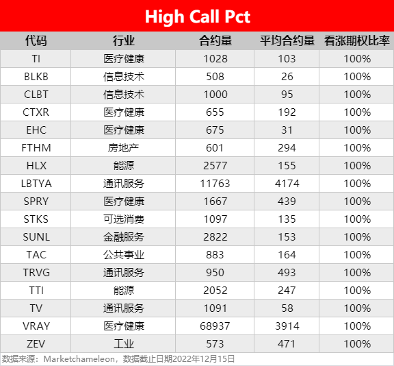 当日Call单比率达到100%的个股为17只,前值13, 其中ViewRay等五只医药股看涨期权比率达到100%。