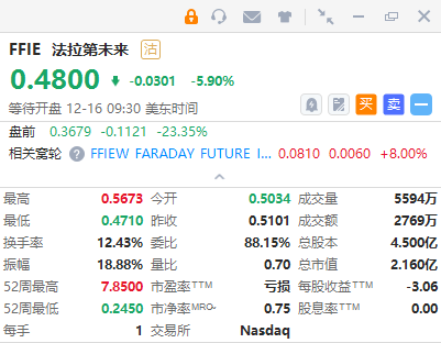 法拉第未来盘前一度跌30%,截至发稿跌幅收窄至23.35%,此前公司表示可能在明年3月底前开始生产第一批电动SUV,但首先必须筹集1.5亿至1.7亿美元资金。截至11月底,该公司仅有2250万美元现金。
