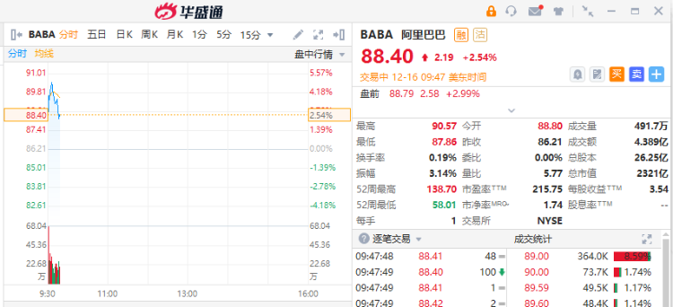阿里巴巴涨2.54%,报88.40美元,盘前,根据The Washington Service的数据,阿里巴巴联合创始人蔡崇信拥有的一家控股公司本月提交了文件,计划通过摩根士丹利出售300万份阿里巴巴美国存托凭证(ADR),约占蔡崇信所持有阿里巴巴股权的8%左右。按周四收盘价计算,这部分股权价值约2.6亿美元。