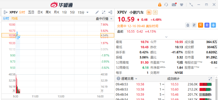 小鹏汽车涨4.49%,报10.59美元,据港交所披露文件:摩根大通增持小鹏汽车843万股(H股),涉资3.49亿港元,12月12日,摩根大通在小鹏汽车的H股持股比例从5.64%增加至6.25%。