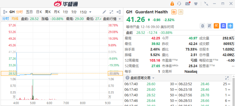 液体活检公司Guardant $GH 盘前一度大跌超30%,最新测试结果令投资者失望
