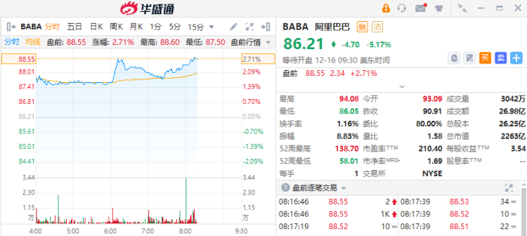 截止北京时间21:16,阿里巴巴盘前涨2.71%,报88.55美元。