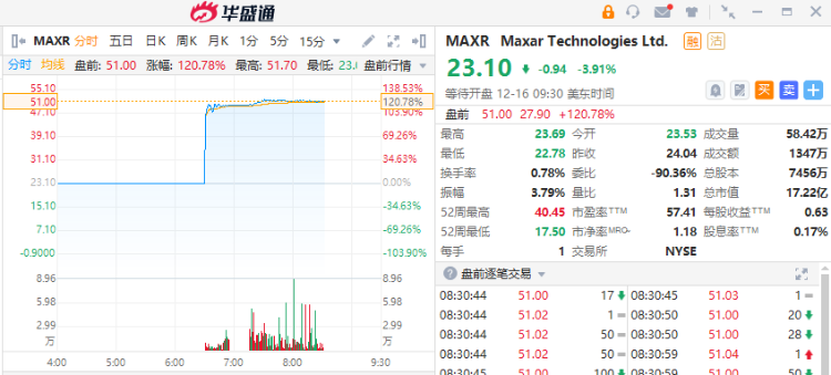 航天技术公司Maxar Technologies $MAXR 盘前一度暴涨超120%