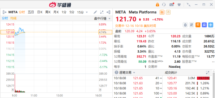 Meta Platforms涨4.78%,此前摩根大通将Meta $META 评级上调至超配,并将其目标价上调至150美元。