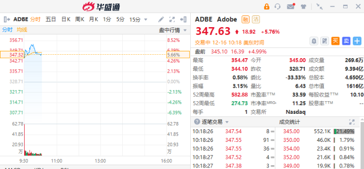Adobe涨5.76%,2022财年Q4营收同比增长10%至45.3亿美元。